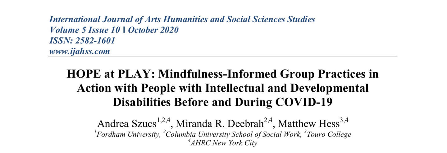 Szucs, A., Deebrah, M. R., & Hess, M., 2020. HOPE at PLAY: Mindfulness-Informed Group Practices in Action with People with Intellectual and Developmental Disabilities Before and During COVID-19. International Journal of Arts Humanities and Social Sciences Studies, 5(10), pp. 69-79.