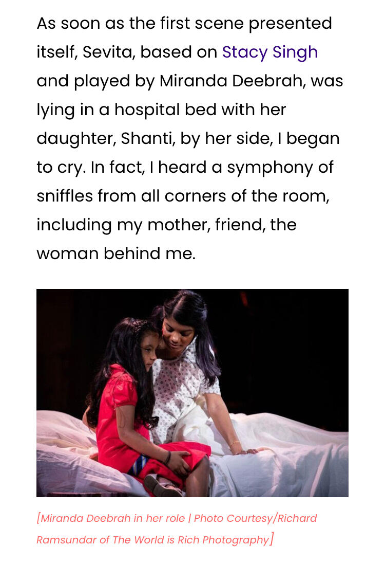 Miranda Rachel (she/her) is an Indo-Guyanese writer, director, performance artist, and storyteller who combines art and activism to increase representation and visibility for the Indo-Caribbean and Indentured Indian Diasporas.She previously directed and starred in various South Asian/Indo-Caribbean-centric theatrical productions (“Yoni ki Raat”, 2017; “Jahajees Rising”, 2018; “YKR: Decoded”, 2019) and appeared in the documentary film “Double Diaspora: A Portrait of Indo-Caribbeans in New York”, directed by filmmaker Lissa Deonarain.She is a 2019 Honoree for Ignite Caribbean’s 30 Under 30 Changemakers Awards in recognition for her Cultural Leadership. In 2021, she was awarded a City Corps Arts Grant from The New York Foundation for the Arts.Additionally, Miranda is the founder and curator of Coolie Women — a personal educational project that centers and honours women of Indentured heritage throughout history.Miranda is a licensed mental health therapist with a Master’s of Science in Social Work degree from Columbia University. She hopes to specialize in ancestral, intergenerational and historical trauma to facilitate healing in her communities.