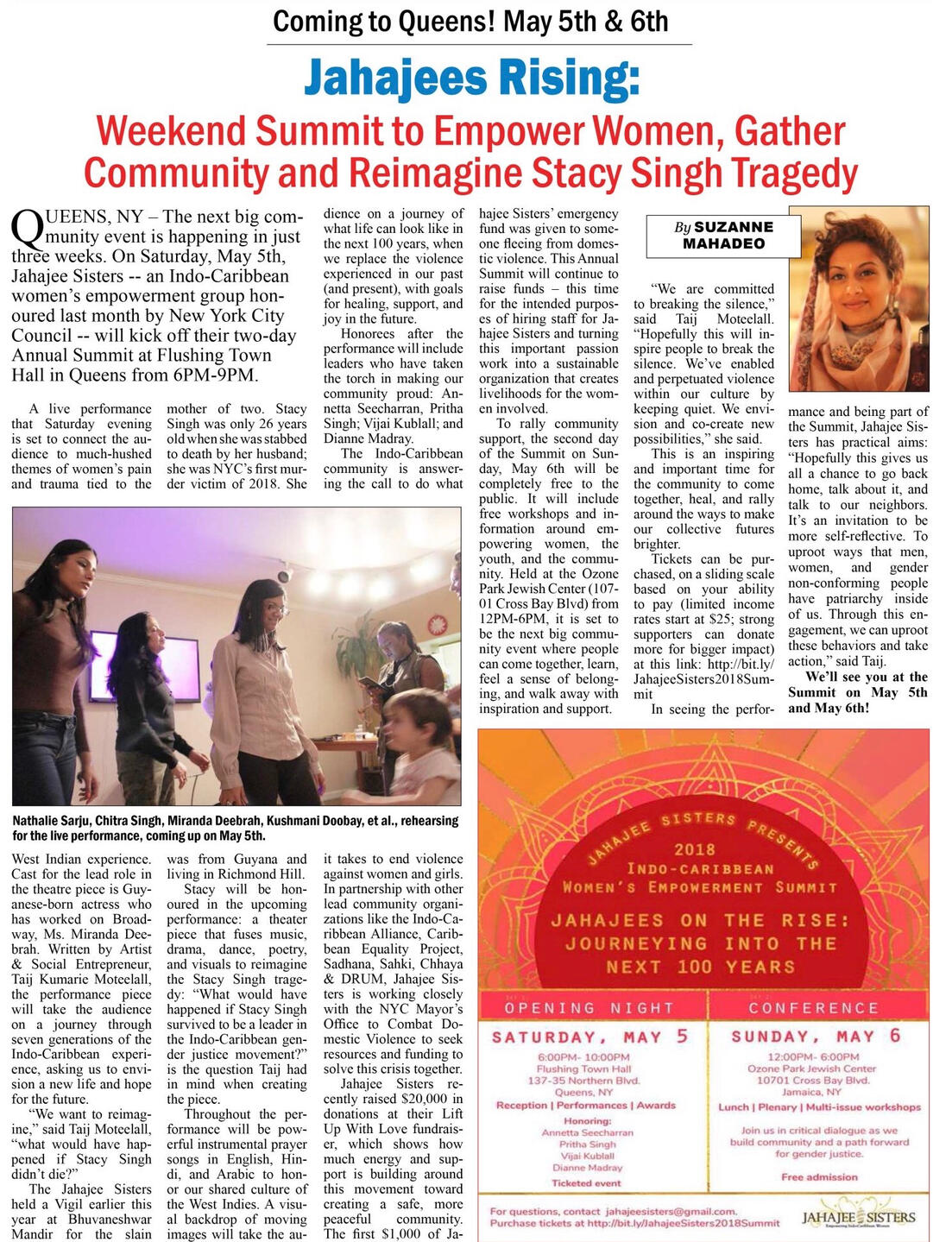 Jahajees Rising: Weekend Summit to Empower Women, Gather Community and Reimagine Stacy Singh Tragedy by Suzanne Mahadeo — published April 2018