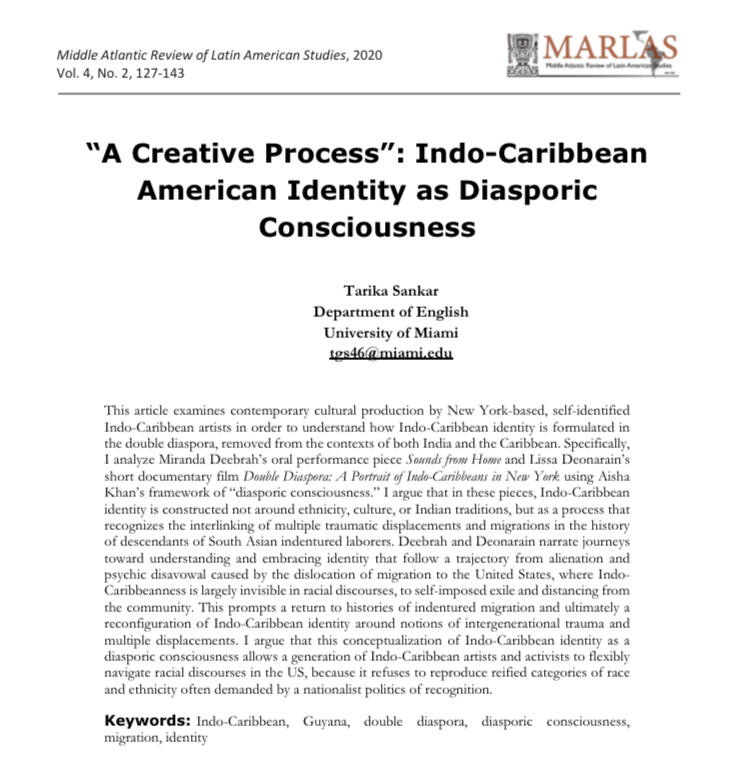 Sankar, T., 2020. “A Creative Process”: Indo-Caribbean American Identity as Diasporic Consciousness. Middle Atlantic Review of Latin American Studies, 4(2), pp. 127–143. DOI: http://doi.org/10.23870/marlas.289