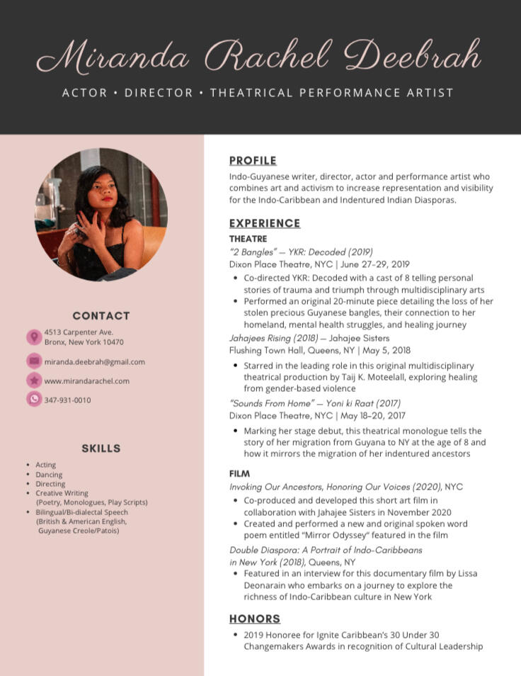 Miranda Rachel (she/her) is an Indo-Guyanese writer, director, performance artist, and storyteller who combines art and activism to increase representation and visibility for the Indo-Caribbean and Indentured Indian Diasporas.She previously directed and starred in various South Asian/Indo-Caribbean-centric theatrical productions (“Yoni ki Raat”, 2017; “Jahajees Rising”, 2018; “YKR: Decoded”, 2019) and appeared in the documentary film “Double Diaspora: A Portrait of Indo-Caribbeans in New York”, directed by filmmaker Lissa Deonarain.She is a 2019 Honoree for Ignite Caribbean’s 30 Under 30 Changemakers Awards in recognition for her Cultural Leadership. In 2021, she was awarded a City Corps Arts Grant from The New York Foundation for the Arts.Additionally, Miranda is the founder and curator of Coolie Women — a personal educational project that centers and honours women of Indentured heritage throughout history.Miranda is a licensed mental health therapist with a Master’s of Science in Social Work degree from Columbia University. She hopes to specialize in ancestral, intergenerational and historical trauma to facilitate healing in her communities.