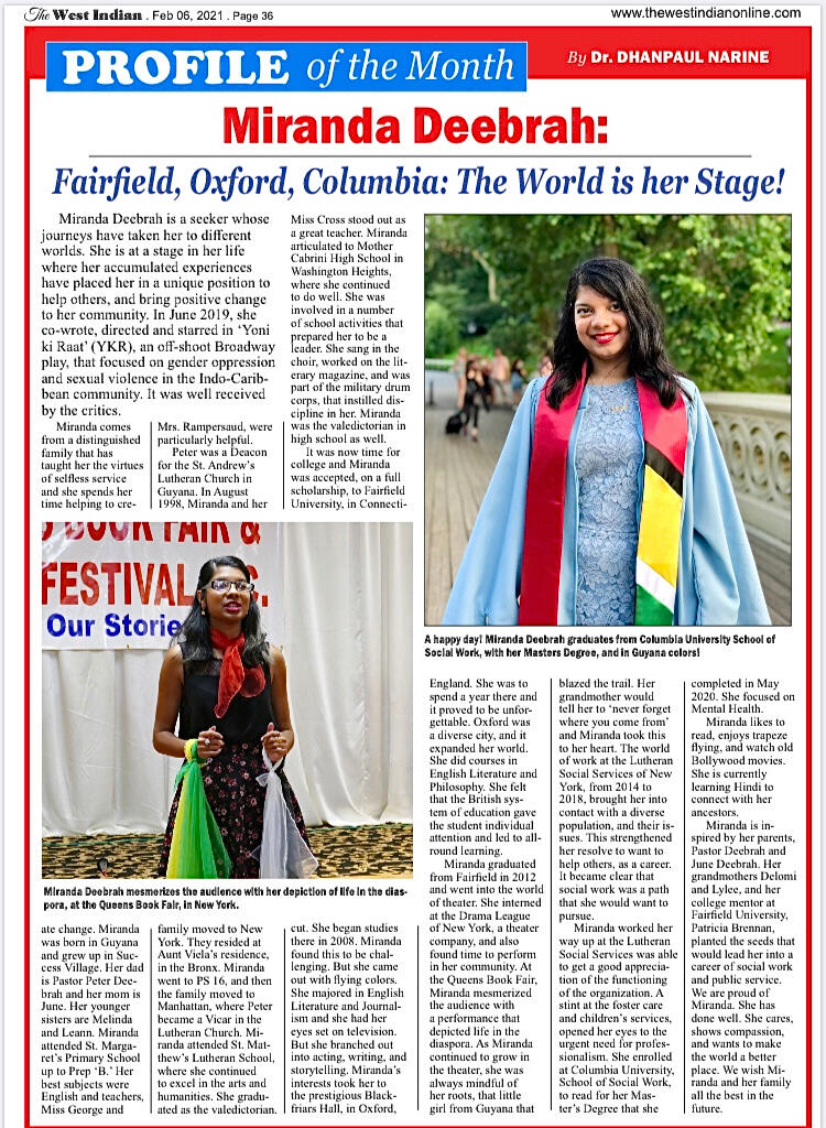 Miranda Deebrah: Fairfield, Oxford, Columbia – The World is her Stage! by Dr. Dhanpaul Narine — published February 2021